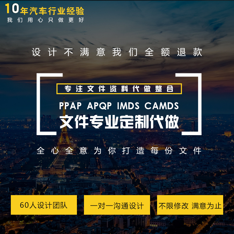 專精于五金件、注塑件、緊固件,特殊加工零件,汽車零部件等產(chǎn)品的PPAP、IMDS、CAMDS、FMEA、8D報(bào)告等技術(shù)文件輔導(dǎo)制作服務(wù)。